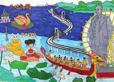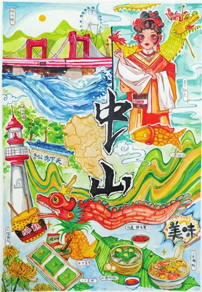 每一笔色彩都藏着纯粹的热爱,每一幅画作都是对家乡最真挚的告白。同学们带着对中山的满心欢喜,用画笔勾勒城市的美好。孙中山故居的青砖黛瓦、岐江两岸的流光溢彩、地方美食的烟火滋味,都在童趣的笔触下变得鲜活生动。