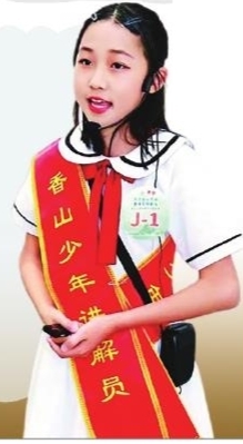 周末的香山书院・香山少年馆,总能看到石岐中心小学四年级同学王悦潼的身影。她穿着香山书院的马甲,声音虽不算洪亮,却能将黄佐、孙中山、阮玲玉、郑君里等香山名人的事迹,讲得清晰又生动,深深打动着在场的每一位听众。