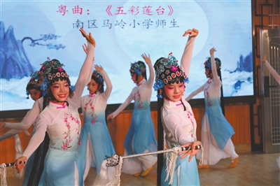 “银钏金钗来负水,长刀短笠去烧畲。”在粤语诵读环节,由该校六3班学生带来诗人刘禹锡的《竹枝词》诵读。只见孩子们一字一句品读古诗,粤语的童声发音为这首经典的古诗增添一份古韵。同学们还演唱了粤语歌曲《声声慢》、表演粤曲《五彩莲台》等。
