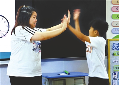 中山市三乡镇鸦岗小学校长简艳走进一(9)班时,孩子们正在上课。坐在椅子上东张西望的小颜,看见她便露出笑容:“校长好”。简艳伸出手,和她轻轻击了个掌。小裕举手发言,先把椅子轻轻推进课桌,才走上讲台。他比划着指出答案,老师一边夸奖他,一边和他击了个掌。小裕笑容满面回到座位,轻轻拉开凳子坐下。