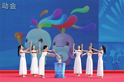 上午10时,火种采集仪式正式开始。国旗护卫队员迈着矫健整齐的步伐,护卫着中华人民共和国国旗进入会场,全场奏唱中华人民共和国国歌。十五运会和残特奥会的火种采集分为“源火”采集和“圣火”点燃两个阶段。在“源火”采集阶段,通过在深海海底1522米处采集可燃冰,并在原位引燃生成“源火”,实现了“深海逐梦、燃冰成炬”的创举。