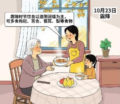 《月令七十二候集解》写道:“九月中,气肃而凝,露结为霜矣。”霜降时节,万物随寒气增长而萧瑟。此时气候呈现燥、寒等特征,“秋燥”余威仍在,而气温骤降,寒邪易侵袭人体。作为秋天最后一个节气,霜降也意味着冬天即将开始。