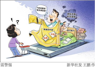 走访过程中,记者发现,一些床上用品“四件套”存在以次充好问题,宣称的“A类母婴级”“高支高密度”实际是忽悠消费者的幌子。