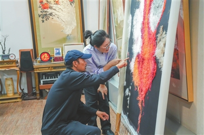 谈及10月16日与任达华的跨媒介艺术实验,周雪清透露,他们为此筹备了一年多。“其实,早在2023年2月,任达华先生来我的工作室参观,对我们的刺绣产生了浓厚兴趣,那时合作就开始了。”《炫目・任达华(Luminance by Simon Yam)》展览以“情感传递”为核心,汇集了任达华油画、水墨及跨界合作作品。作为全场焦点的《丝蕴》突破性地融合了任达华的光影艺术灵感与周雪清独创的“雪花针法”,通过三针线交叉的立体绣法,将丝线细分为六十四分之一,以五十余种色线构建出层次丰富的光影效果。此次合作中,周雪清将苏绣的细腻与广绣的灵动融入创作,通过精准的数学几何定位勾勒线条,使柔性丝线完美呈现光影的刚性结构。