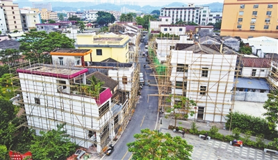 沿着“朴树下”环田路漫步至南文社区萧氏大宗祠附近,记者看到,景行街周边农房的外立面改造工程已经启动。身着“中泓实业”工作服的工人站在脚手架上正给民房外墙贴砖。