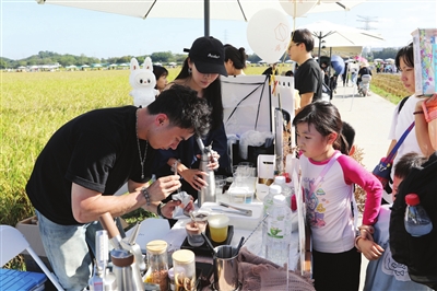 当天上午10时起,崖口村2000亩稻田周边热闹非凡。60多家咖啡馆集体“下乡”,搭建起咖啡生活集市,手冲特调、烘焙轻食、咖啡文创等品类应有尽有,游客穿行稻田间沉浸式感受“稻田+咖啡”的独特魅力。首场“稻田咖话会”上,明品绘咖啡相关负责人围绕“咖啡豆知识”展开快闪公开课,现场讲授选豆技巧、咖啡热词等内容,互动环节还送出多张咖啡消费券,让市民在金色稻田的丰收氛围中,直观感受“稻田+”的生态魅力与乡村业态吸引力。