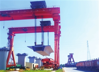 “首片箱梁成功架设,验证了民众制梁场智能生产与架梁施工的成熟度。”项目相关负责人表示,针对箱梁腹板高、钢筋密集等施工难点,技术团队通过优化布料顺序、采用小直径振捣棒强化关键部位振捣等工艺措施,确保箱梁内实外美、强度达标。在架设过程中,技术团队对关键工序实施全过程旁站盯控,对箱梁起吊、运输、落梁等关键工序实行“层层把关、全程监督”,结合智能监测系统实时捕捉数据,保障了重达714吨的“巨无霸”精准对接桥墩,误差控制在毫米级。