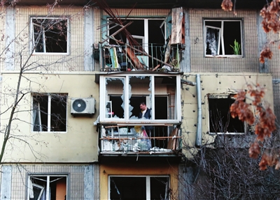 11月14日,在乌克兰首都基辅市第聂伯区,当地居民对遭受空袭损毁的房屋进行清理。