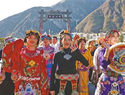 11月19日,在四川省汶川县城,身着民族服饰的妇女参加非遗大巡游活动。