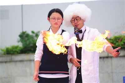 在科学实验秀现场,老师们化身“魔法师”,将“水火相容”“液氮蘑菇云”瞬间升腾等一个个震撼的实验呈现出来,让学子们更直观感受到物理、化学的原理,现场惊呼声、掌声不断。