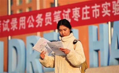 11月30日,在山东省枣庄市实验小学(薛城)考点,一名考生在入场前复习。