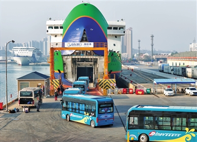 11月30日,一批全新的纯电动公交车在山东港口烟台港登上新能源汽车运输船“绿安达”轮,跨越渤海海峡前往辽宁大连,交付大连交运集团(无人机照片)。