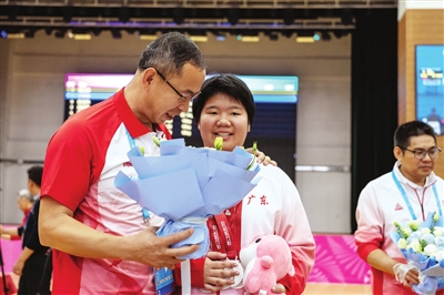 袁敏旖是最后加入特奥举重项目广东一团的队员,她不爱说话,小小的个子却有很强的爆发力。极富运动天赋的她,2021年曾赴德国参加篮球比赛拿下四枚金牌。然而初练举重时却连杠铃都不敢上架,一碰到肩膀就往后倒,存在不小的安全隐患。“一直没办法,我们也很着急,没想到有一天,她自己突然就会了!”看着敏旖在残特奥会上的成绩,再回想起她克服恐惧、突破技术瓶颈的那天,李楚鑫仍兴奋不已。