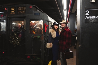 12月14日,在美国纽约,人们身着怀旧服饰准备乘坐“怀旧地铁”。