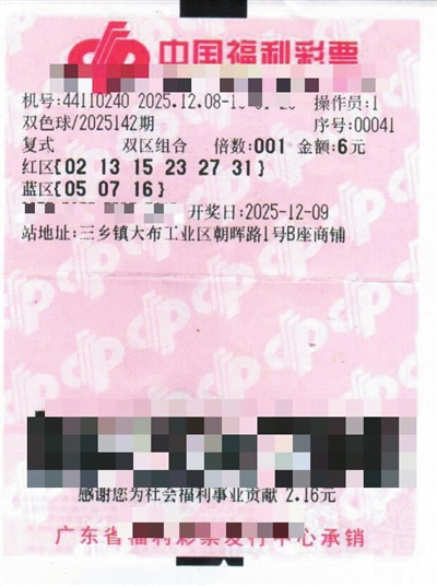 12月9日晚,中国福利彩票“双色球”第2025142期开奖,全国共中出3注一等奖,单注奖金高达1000万元。其中1注由中山市三乡镇大布工业区朝晖路1号B座商铺的44110240号福彩销售站点售出。