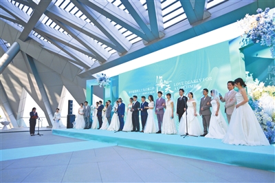 下午2时30分,西人工岛观景平台响起悠扬的钢琴声,西人工岛开业盛典的重头戏“爱你一生”集体婚礼拉开序幕,10对新人身着精致盛装惊艳亮相,在大海的见证下许下爱情的誓言。新娘们雪白的婚纱各有风情,与浪漫海岛的现场氛围完美相融。此时,钢琴声缓缓流淌,与海浪轻拍西人工岛“哗哗”声交织在一起,构成一曲独特的浪漫乐章。