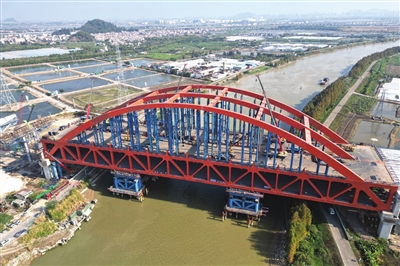 “去年12月,主桥实现拱圈合龙,黄沙沥特大桥的施工已进入最后冲刺阶段。”中山东环高速总承包项目A段经理部副总工程师滕龙表示,中山东环高速A段起点自中山黄圃镇大雁村,终点至三角镇东会村,路线全长11.458公里,包含桥梁9座(其中特大桥6座共10037米、大桥3座共1301米)及大雁枢纽、黄圃港、三角北3处互通立交。其中,重点工程黄沙沥特大桥南北走向横跨黄沙沥水道,主跨长达202米,桥面总宽45米,全桥用钢量达12000吨,建成后将成为国内最大跨径的三桁式双层钢桁拱桥。