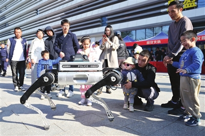 互动体验区成为全场焦点,巡逻机器狗的灵活动作与警犬的服从性表演赢得阵阵喝彩,小朋友们争相合影,民警主动上前协助,现场充满欢声笑语。面对小朋友“机器狗能帮警察叔叔做什么”的疑问,民警耐心解答其巡逻、实时传图等功能。