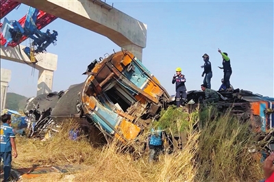 这是1月14日在泰国呵叻府拍摄的事故现场(手机照片)。据泰媒报道,14日上午,泰国呵叻府一台起重机在高铁项目施工过程中坠落,砸中一列正在行驶中的火车,导致车厢起火并脱轨,已造成22人死亡,另有55人受伤。新华社 发