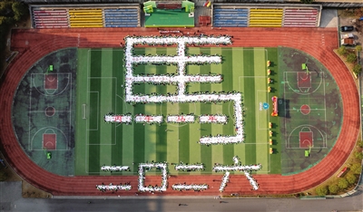 这是荣县树人小学校操场上的巨型“马”字画布(1月14日摄,无人机照片)。