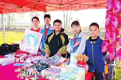 接源小学五年级学生皮雅菲的摊位前,摆满了以马元素为主题的手工作品和别致的猫咪摆件,造型精巧、童趣十足。“这些都是我们美术班同学做的,每个3-5元,所得款项将捐赠给需要帮助的人。”皮雅菲仰着小脸,语气里满是成就感。不远处,三民小学的同学们也带来了手工制作的挂件、手写福字等义卖品。“我们和老师一起准备了好几个星期,能通过义卖帮到别人,特别有意义!”几位五六年级的同学异口同声地说。