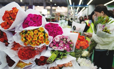 2月1日,人们在昆明的斗南花卉市场内选购鲜花。