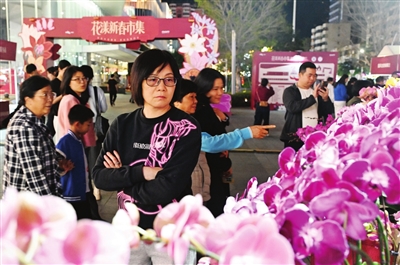 当晚7时30分,微风轻拂,市集现场传来温馨的歌声。记者看到,在火红的主题装饰与璀璨灯串映照下,各式年花争奇斗艳:寓意吉祥的蝴蝶兰、喜庆的北美冬青、硕果累累的橘子树构成一片缤纷花海,不少市民在摊位前仔细挑选,将春意与福气抱回家。
