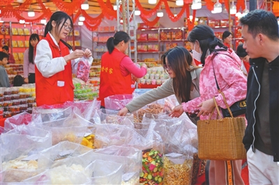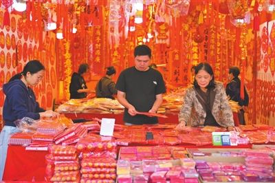 除了悦目的年花年桔,触动味蕾与记忆的传统年货,同样是花市的必备章节。酥心糖、煎堆、油角的香气在空气中弥漫,瞬间唤醒关于童年的味觉记忆;火红的对联、精巧的挂饰、烫金的利是封,在眼前铺陈开来,点燃人们对新岁红火生活的具象憧憬。