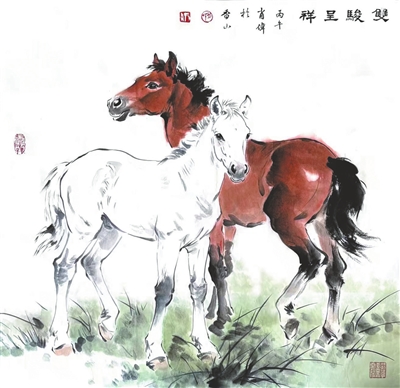《双骏呈祥》 中国画 尺寸:68×68cm 作者:肖伟