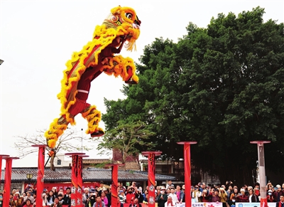 据悉,本次赛事设高桩南狮、传统南狮2个项目,分别于18日上午和下午展开角逐。赛场之上,一只只色彩艳丽的醒狮昂首登场,一跃跳上1米多到数米高的高桩。只见狮子们熟练地在高桩上行走,如履平地、行云流水,还不时模拟各种“眨眼”“抹眼”“搔首”等拟态动作,灵动可爱。不一会儿,闪扑回旋、倒挂金钩、钳腰饮水、腾空飞跃、后空翻、飘移挂桩、飞桩越桩等一个个高难度动作接连上演,看得观众直捏一把汗。最后,狮子们完成“吞青”“碎青”“吐青”等仪式性动作,下桩谢礼。观众席瞬时响起雷鸣般的掌声。