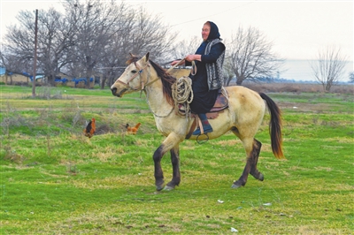 采访临近结束时,艾哈迈多娃向记者展示骑术。只见她熟练地跨上马背,并未急着驰骋,而是左手挽住缰绳,右手轻抚马颈,指间还夹着根枯树枝做成的简易马鞭。“马是人最忠实的朋友,只要骑上马,我感觉自己就是年轻人”。”