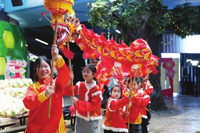 2月25日,小朋友在杭州青少年活动中心参加舞龙表演。2月25日,浙江杭州青少年活动中心“Do都城”少儿社会体验馆举办“新春赶大集”主题活动。小朋友参加舞龙舞狮表演,体验传统手艺,通过一系列活动感受年俗。新华社 发