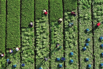 2月24日,农民在四川成都市彭州市九尺镇玉源社区的田地里采收油麦菜(无人机照片)。