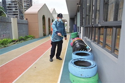 春季开学在即,中山不少学校、幼儿园扎实开展开学前四害消杀、环境消毒及校园安全检查工作,迎接学子归来。图为2月28日,香山幼儿园工作人员对园内易孳生蚊虫的空间进行消杀作业。本报记者 缪晓剑 王帆 摄影报道