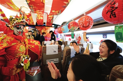 元宵节来临之际,中国铁路哈尔滨局集团有限公司齐齐哈尔客运段担当的齐齐哈尔南开往天津西的G1280次列车上举行“闹元宵·话团圆”主题活动,车厢内张灯结彩,民族歌舞、舞狮、变脸等节目接连上演,让旅途充满节日温情。新华社 发
