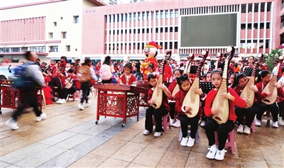 东区雍景园小学内锣鼓喧天,醒狮时而腾空跃起,时而摇头摆尾,与师生热情互动。同学们争相上前摸摸狮头,沾沾吉祥福气。中山市香山小学民乐团奏响《步步高》,书法校队队员挥毫泼墨书写福字。“一击鼓,敬长辈,明志向;二击鼓,爱学习,勤努力……”击鼓鸣志环节中,同学们排队击鼓,鼓声里满是对新学期的期盼。东区水云轩小学同步开展“福满校园 喜盈元宵”系列活动,金龙醒狮昂首阔步,师生写福画福、集福纳祥,在感受传统年味中凝聚奋进力量。
