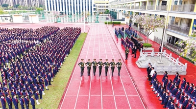 中山市华辰实验中学的开学典礼以爱国主义教育为核心,特邀原天安门国旗护卫队战士亮相。八名战士身着军装,铿锵迈步,以庄严姿态升起国旗。同时,旗手们还向华辰学子展示了“天安门特号旗”,当国旗缓缓拂过学子头顶,崇敬之情与家国情怀在校园升腾。