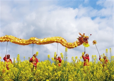 3月2日,人们在四川省达州市达川区龙会乡的油菜花田间表演舞龙。春暖花开,神州各地春意融融。人们纷纷来到户外踏青赏花,乐享春光。新华社 发