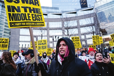 2日傍晚,数百名抗议者冒着严寒在纽约市哥伦布圆形广场集会,组织方代表发表演讲,人们手持标语,大声呼喊反战口号,要求“停止针对伊朗的战争”,随后开始游行示威。