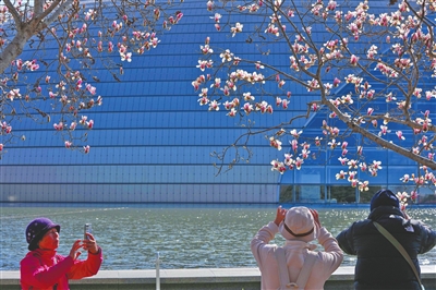 3月9日,游客在国家大剧院旁欣赏盛开的玉兰花。近日,随着气温回升,北京街头的玉兰花渐次开放。新华社 发