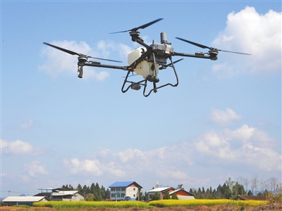 3月10日,植保无人机在四川省达州市渠县文崇镇谭坝社区6组进行喷洒作业。
