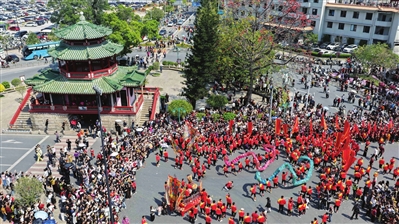 当日,在广东揭阳城隍庙会上,青狮、舞龙、英歌舞等非遗表演精彩上演,吸引众多市民游客观看。农历正月二十三举行的揭阳城隍庙会是当地盛大的传统民俗文化活动之一。新华社 发