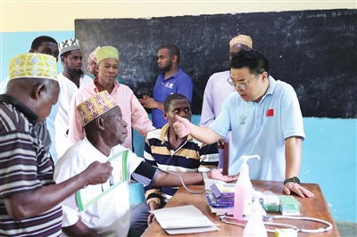 3月18日,中国援桑给巴尔医卫专家在坦桑尼亚桑给巴尔奔巴岛一社区进行义诊。