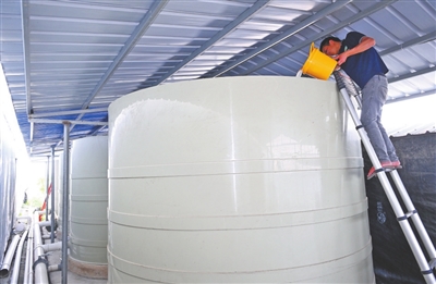 处理后的水并非直接使用,还需加入芽孢杆菌、乳酸菌等有益菌重新培水。庞大的罐体中配备3000多立方米育苗水体,储备26000立方米配水,水苗配比达1:5,应对极端天气游刃有余。