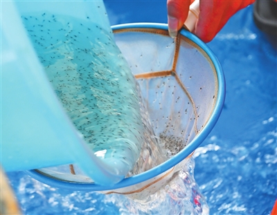 等虾苗吃完食,庞伟志顺手舀起一瓢虾苗放入玻璃瓶中,在阳光下仔细观察——小虾苗的肝脏、胃、肠道、体色等情况一目了然。更重要的是,虾苗中没有泛白的,活力都很好,“万一出现几个白的,就可能是产生了应激反应,必须立刻处理,否则泛白的虾苗会越来越多,不仅这一池会报废,甚至可能影响整个车间的虾苗。”庞伟志说。