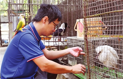 工作日清晨七点半,区肇和已开始忙碌起来。先给鸟儿们刷水盆食盆,再换饲料,仔细观察每只鸟的状态,这是判断它们有没有生病的基础工作。