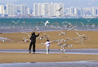 4月7日,游客在河北省秦皇岛市北戴河区沿海地区给海鸥喂食。近日,大批海鸥聚集于河北省秦皇岛市北戴河区沿海地区,在蓝天碧海间起舞。新华社 发