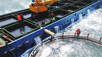 4月10日,在山东青岛西海岸新区鲁海丰海洋牧场,工作人员进行鱼苗投放作业。