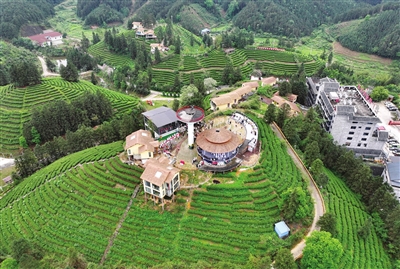 4月12日,在广西融水苗族自治县水融香粤桂协作现代农业产业园,人们在茶山上品茶、制茶(无人机照片)。新华社 发
