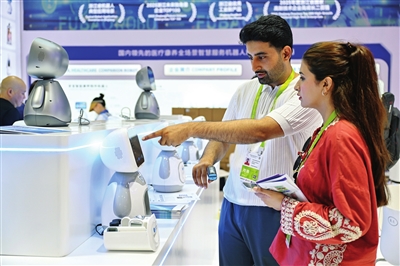 4月13日,第六届中国国际消费品博览会在海南举办。本届展会是海南自贸港全岛封关运作后的首届国家级消费盛会,以“开放引领全球消费,创新驱动美好生活”为主题,汇聚了来自60多个国家和地区的超过3400个品牌参展,搭建起全球消费精品展示交易的国际化平台。图为参观者在第六届消博会现场了解一款康养陪伴机器人。新华社 发